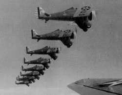 In October 1934, the group (by then three flying squadrons strong) made its first aircraft transition -- from the P-12 to the Boeing P-26 Peashooter. This open cockpit monoplane had a 600 horsepower engine and a top speed of 253 miles per hour. Like the P-12, it possessed two .30 caliber machine guns. Unlike its predecessor, it also featured wing-mounted bomb racks.