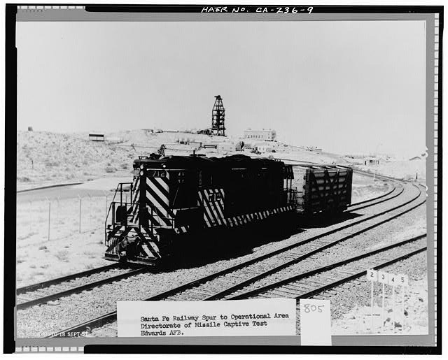 'SANTA FE RAILWAY SPUR TO OPERATIONAL AREA, DIRECTORATE OF MISSILE CAPTIVE TEST, EDWARDS AFB'; Photo no. '11,381 57; G-AFFTC 18 SEPT 57'. Test Area 1-115. Photo shows engine no. 712 pulling one car. The superstructure of Test Stand 1-4 is prominent in the background.