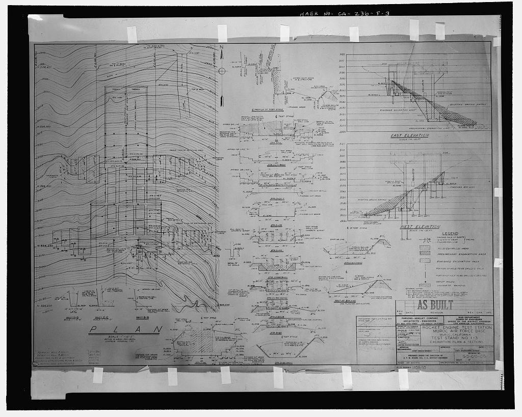 'TEST STAND NO. 1-3, EXCAVATION PLAN & SECTIONS.' Specifications No. ENG 04-353-50-10; Drawing No. 60-0906; no sheet number within title block; D.O. SERIES 1109/10. Stamped: AS BUILT. No revisions or revision dates. Last work date on this drawing 'Checked by EAG, 1/31/49.' Though this drawing is specific to Test Stand 1-3, it also illustrates the general methods used for excavation design and retaining wall construction at Test Stand 1-5.