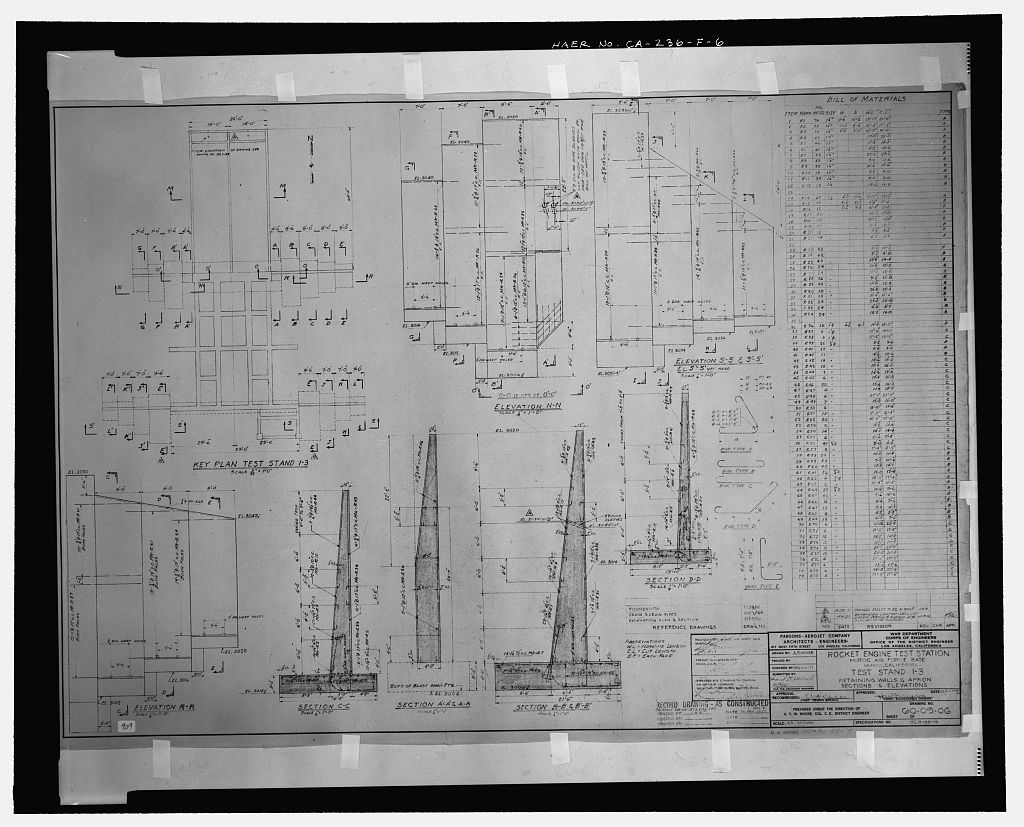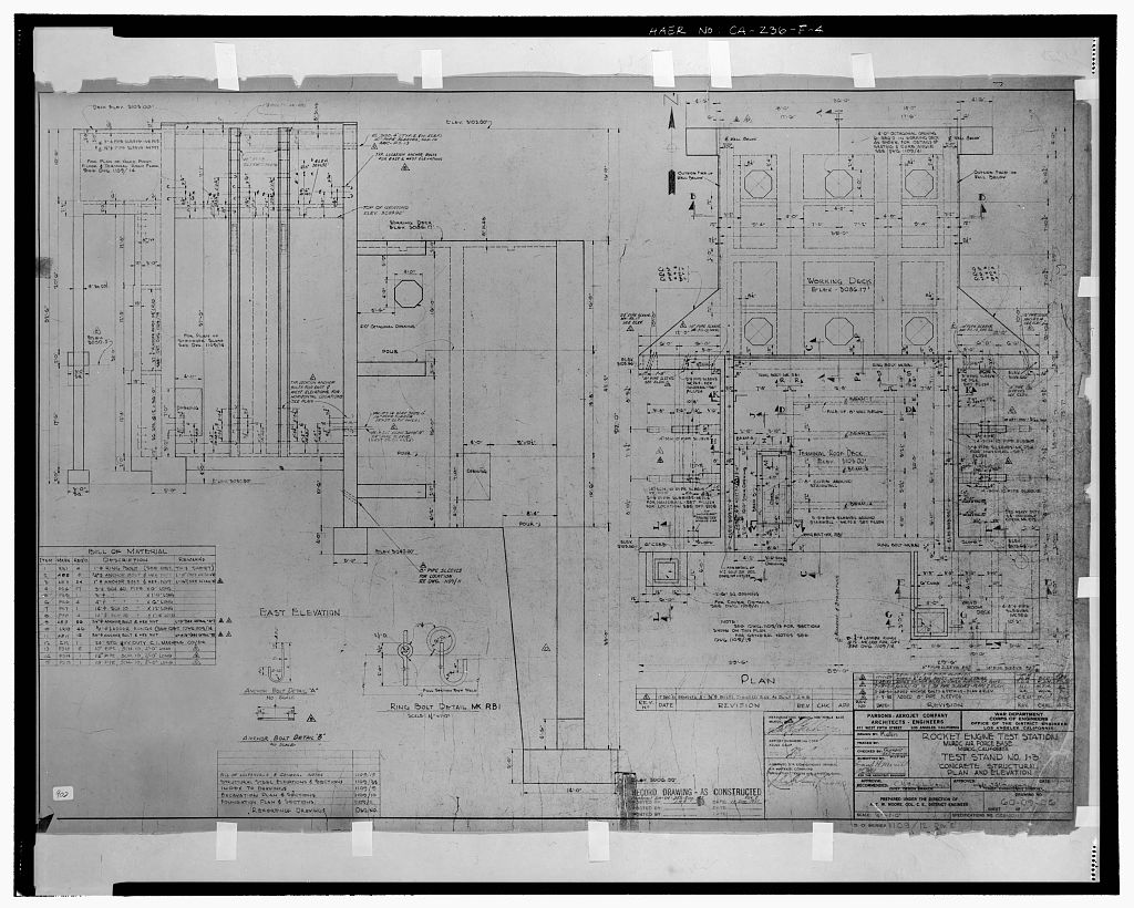 Bldg. 8698, Test Stand 1-3. The existing structural base of Test Stand 1-3 is a reinforced, poured concrete structure stepped against the northern side of Leuhman Ridge (CA-236-F-1 and CA-236-F-3 through CA-236-F-6). The overall measurements of the base, including the terminal roof deck, the valve room deck, and the working deck, are 59 feet wide by 75 feet long, with a maximum height of 92 feet (from the north footing of the working deck to the roof deck of the terminal room). The at-grade deck of the structure is rectangular in shape, measuring approximately 44 feet wide by 38 feet deep. A small rectangular opening on this deck provides access to rooms below grade that were control and terminal rooms. Steel posts around the edge are all that remain of tiie original railings. On the eastem and western sides of this section of the test stand base are U- shaped cells measuring approximately 25 by 11 feet and approximately 50 feet high. The walls of the terminal room structure are the base of the U and have two parallel steel anchor bolts running vertically from the base of the stand to the terminal roof deck. The 20-foot-wide- by 15-foot-long valve room deck is located in the southeastern comer of the terminal roof deck and has a small opening with a wall-mounted steel ladder leading to the valve room below. Immediately north of the terminal roof deck, and 15 feet lower, is the irregularly shaped working deck. This deck is 60 feet wide at the juncture with the terminal room structure, 36 feet wide at the center, and 45 feet wide at the northern edge. The overall length of the deck, from the terminal room to the northern edge, is 29 feet.