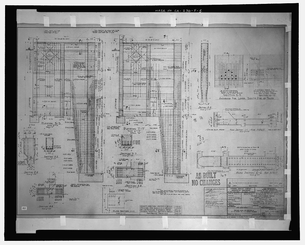 'TEST STAND 1-3, CONCRETE STRUCTURAL SECTIONS AND DETAILS.' Specifications No. OC12-50-10; Drawing No. 60-09-06; no sheet number within title block. D.O. SERIES 1109/17, Rev. A. Stamped: AS BUILT; NO CHANGES. Date of Revision A: 11/1/50.