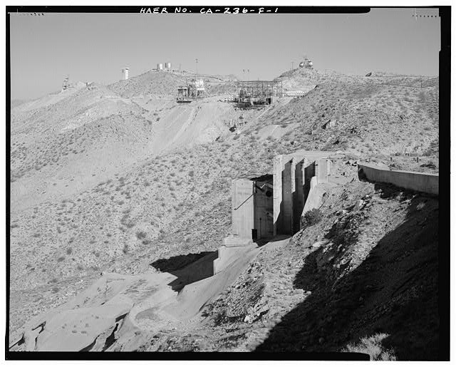 BUILDING 8698, TEST STAND 1-3, WEST ELEVATION. NOTE TUNNEL BETWEEN BLDG. 8668 AND TEST STAND 1-3. TEST AREA 1-120 IN THE MIDDLE DISTANCE, AND TEST AREA 1-125 ON THE HORIZON. Looking northeast from the roof of Building 8668, Instrumentation and Control Center. Note: Photograph CA-236-F-2 is an 8' x 10' enlargement from a 4' x 5' negative. This view is a photocopy of a recent resin coated print made from a print held at the Main Base History Office, Edwards Air Force Base, California.
