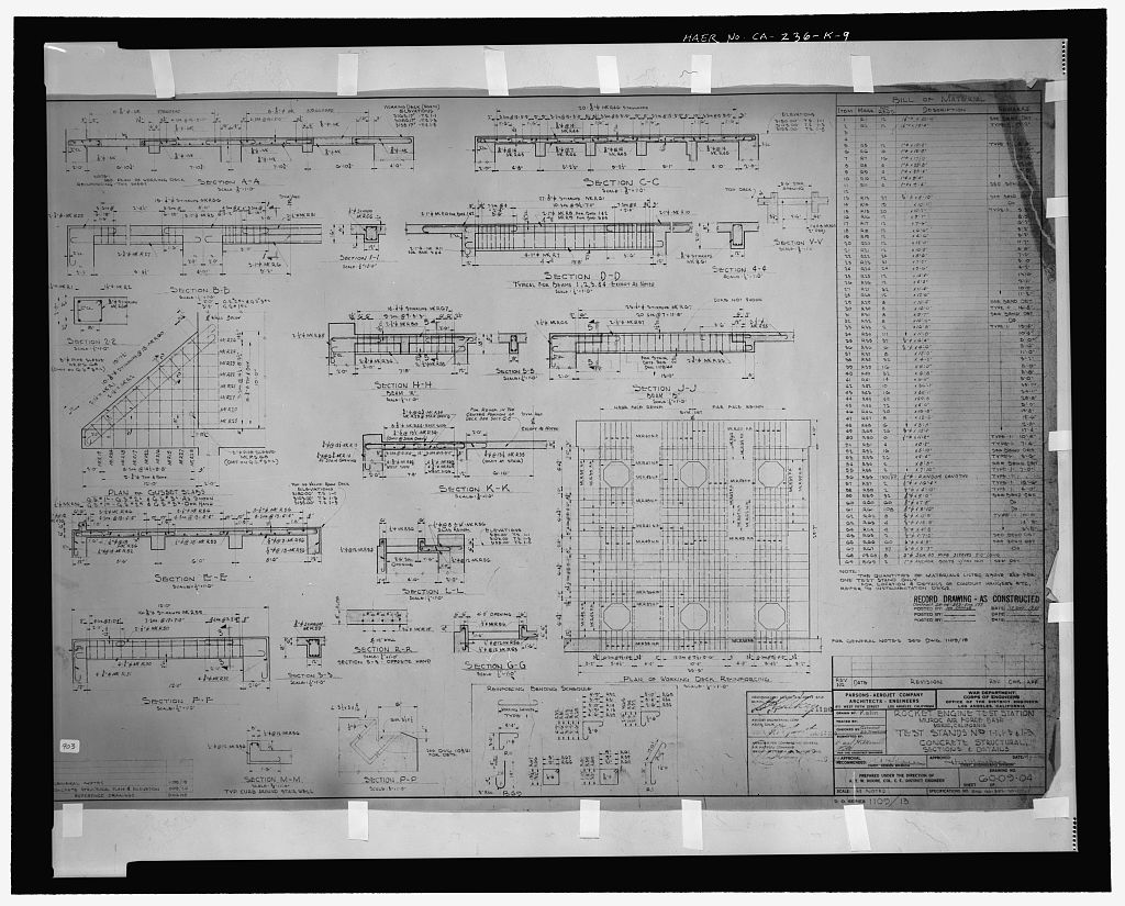 'TEST STANDS NOS. 1-1, 1-3, & 1-5; CONCRETE STRUCTURAL SECTIONS AND DETAILS.' Specifications No. OC12-50-10; Drawing No. 60-09-04; no sheet number within title block. D.O. SERIES 1109/14, Rev. B. Stamped: RECORD DRAWING - AS CONSTRUCTED. Below stamp: Contract DA-04353 Eng. 177, Rev. B; Date: 21 Dec. 1951.