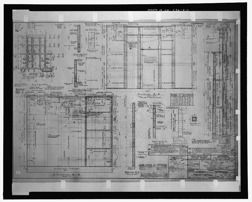Bldg. 8641, Test Stand 1-5. The existing stmctural base of Test Stand 1-5 (including the terminal roof deck, the valve room deck, and the working deck) measures 59 feet wide by 75 feet long (CA-236-K-3 through CA-236-K-6). The maximum height of the building (from the north footing of the working deck to the roof deck of the terminal room) is 92 feet. The ground-level terminal roof deck of the structure is rectangular, measuring approximately 44 feet wide by 38 feet deep (CA-236-K-1). A small rectangular opening on this deck provides access to the control and terminal rooms, which were below grade. Steel posts around the edge of this deck are all that remain of the original railings.
