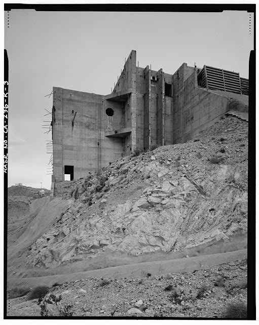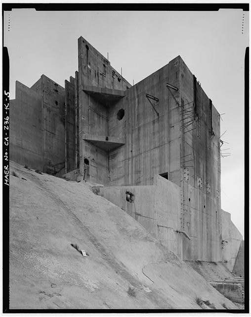 The working deck is 42 feet above grade at the juncture with the terminal room and 75 feet above grade at the northern edge. This deck has six octagonally shaped openings to the structure below arranged in two rows of three. The test stands appear to be in fair condition, with standing water pooling in the rooms beneath the decks, spalling concrete in places, and general lack of maintenance. The superstructure of the building is entirely missing. It was removed during the late 1960s or early 1970s.