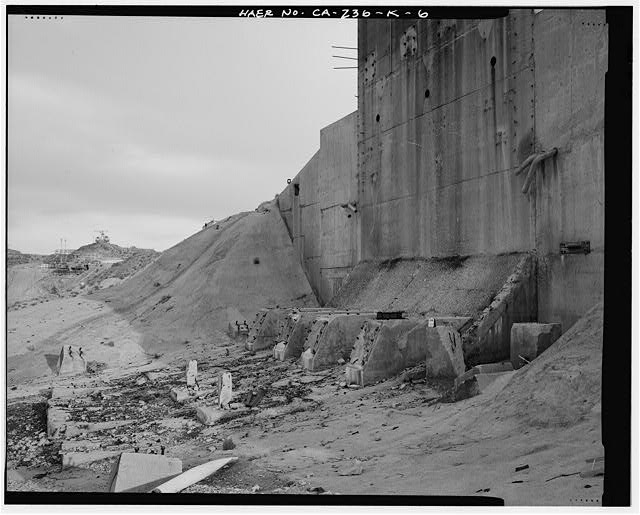 DETAIL OF NORTH ELEVATION AND FOOTINGS FOR FLAME DEFLECTOR, NOW MISSING. Looking east.