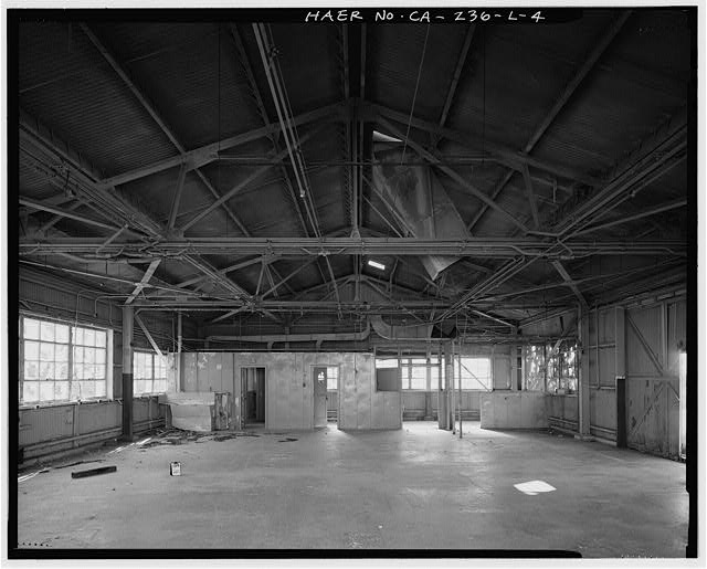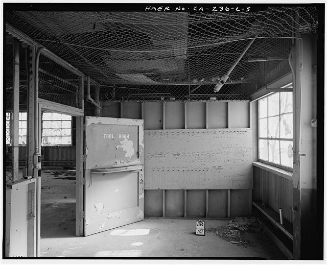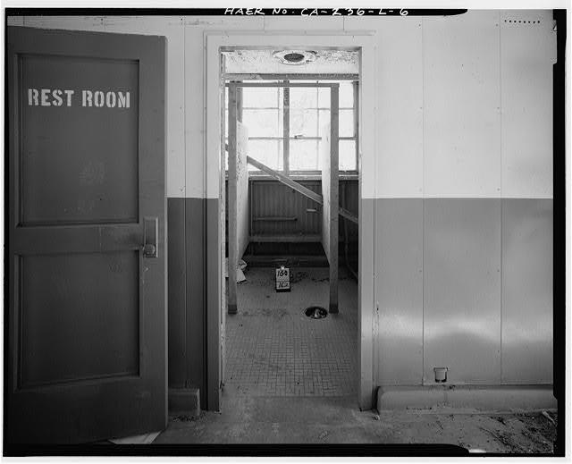 INTERIOR. EXIT HALL AND RESTROOM ARE AT LEFT; TOOL ROOM AT RIGHT. Looking south.
