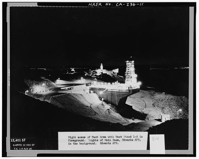 'NIGHT SCENE OF TEST AREA WITH TEST STAND 1-A IN FOREGROUND. LIGHTS OF MAIN BASE, EDWARDS AFB, IN THE BACKGROUND. EDWARDS AFB.' Test Area 1-120. Looking west past Test Stand 1-A to Test Area 1-115 and Test Area 1-110.