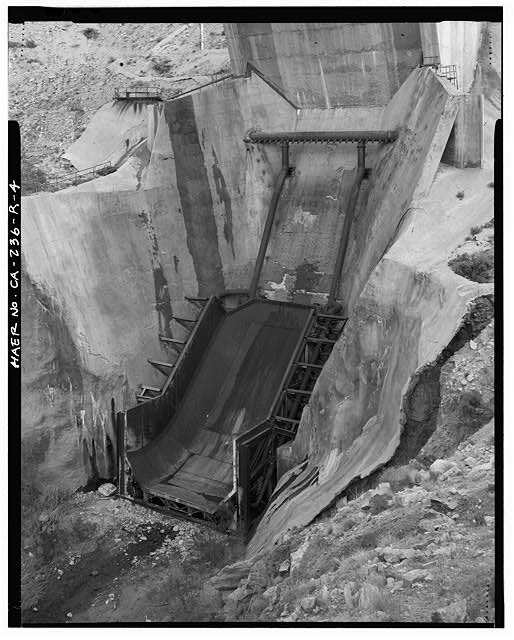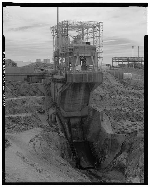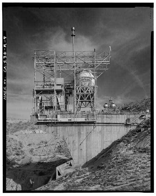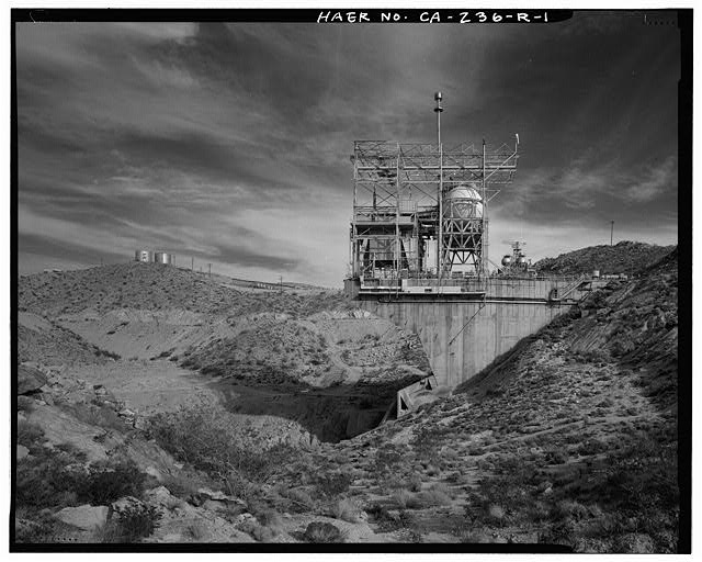 Bldg. 8765 is the substructure of Test Stand 1-A (CA-236-R-1). This massive structure is 70 feet wide and 150 feet high at the northern edge and 50 feet wide and 110 feet high at the southern edge, with an overall length of 203 feet from the northern edge to the southern edge. The entire structure is constructed of reinforced concrete. The top deck of the test stand is level with the road in the test area; thus, the structure is primarily subterranean or cantilevered from the northern ridge face. The overall form of the structure is a two-level rectangle between the northern and southern structural piers and a braced cantilevered deck extending from the northern structural pier. A poured concrete, U-shaped deflector pit descends north from the north structural pier at an approximately 60-degree angle from 45 feet below the topdeck (CA-236-R-4). The top deck has a hole in the northern end measuring approximately 60 feet wide by 40 feet long. The superstructure above the top deck holds the test vehicle above this opening, directing the blast of the rocket down to the flame deflector pit