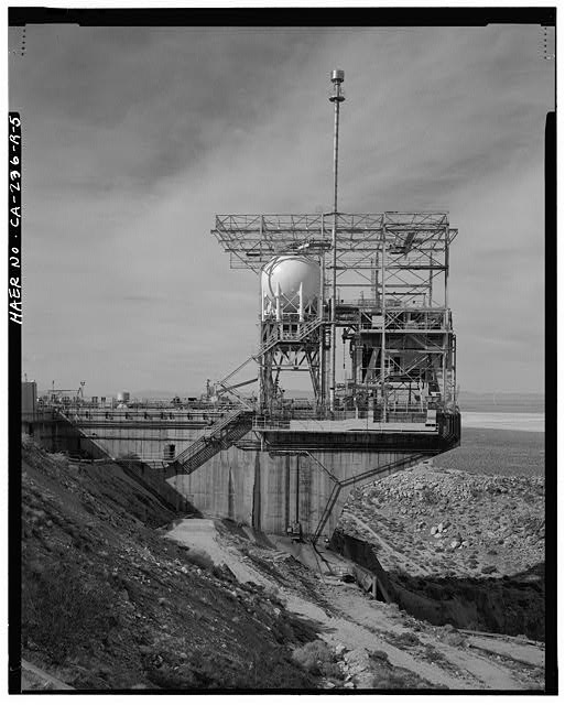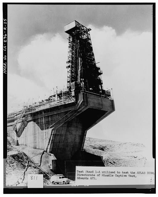 'TEST STAND 1-A UTILIZED TO TEST THE ATLAS ICBM', CROPPED OUT: 'DIRECTORATE OF MISSILE CAPTIVE TEST, EDWARDS AFB.' Photo no. 11,371 57; G-AFFTC 15 OCT 57. Looking southwest from below the stand.