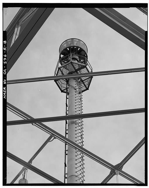 CROWS NEST ATOP SUPERSTRUCTURE. Looking up from northeast corner of run line deck.