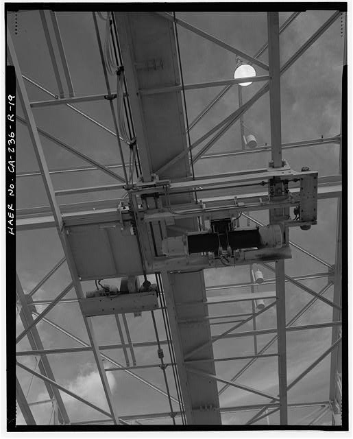 TRAVELING CRANE ATOP SUPERSTRUCTURE, FROM RUN LINE DECK. Looking up to north northeast.
