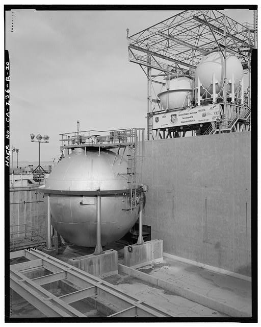DETAIL SHOWING HYDROGEN (LEFT) AND OXYGEN (RIGHT) SPHERICAL TANKS ON RUN LINE DECK, THIRD LEVEL. DARK TONED PIPING IS THE FIRE EXTINGUISHING SYSTEM. Looking south southwest.