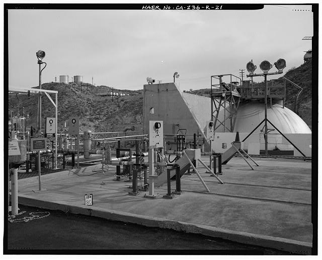 VALVES, GAUGES, AND SEVERAL TYPES OF LIGHTING ALONG ROAD AT SOUTH REAR OF TEST STAND 1-A. RP1 TANK FARM IN MIDDLE DISTANCE. Looking northeast.