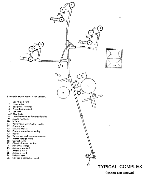 Adjacent to each silo were the propellant storage and equipment terminal buildings, both of which were buried under 17 to 24 feet of earth. Several hundred feet away were the control room and power house. Both were domed structures built of reinforced concrete and buried 10 to 17 feet beneath the surface. The control room was 40 feet high,100 feet in diameter, and housed all of the launch control equipment. The nearby power house was 60 feet high, 127 feet in diameter, and contained generators and the power distribution system. Nestled between the two buildings was the cylindrical entry portal,72 feet deep and 38 feet in diameter, that controlled access to the underground complex.