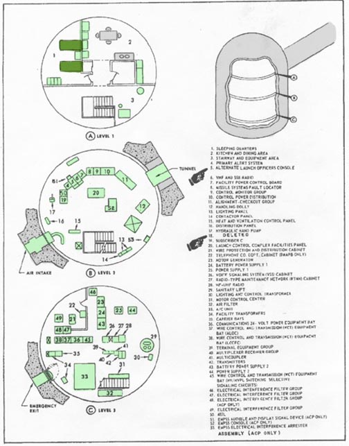 The Launch Control Center (LCC) consisted of 3 levels. Level 1, the top level, contained crew sleeping quarters and dining area. Level 2 contained the launch control equipment. The crew entered the control center on this level. Level 3 contained air handling equipment and backup batteries. The emergency exit hatch was also on level 3.